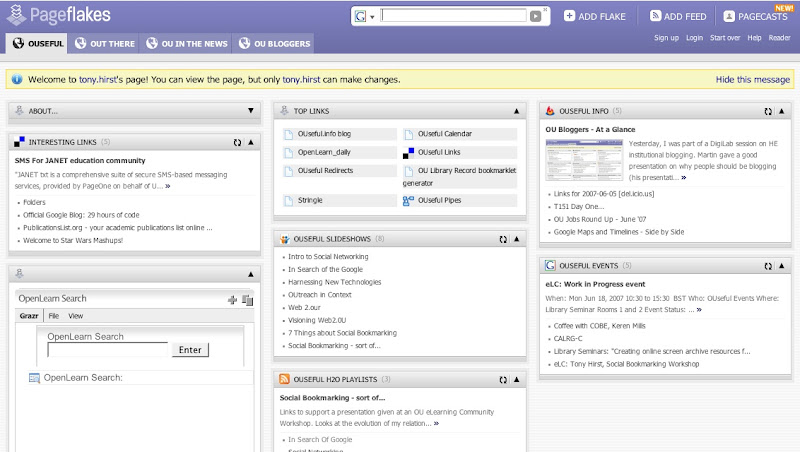 Since posting about the OU Institutional Dashboard Using Pageflakes, I’ve spent quite a bit of time thinking about this sort of surface and how they could be used to both manage and display OPML feeds:
