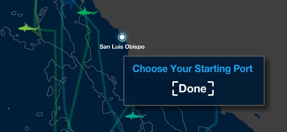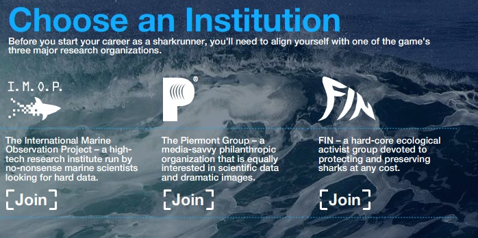 The aim of the game is to use your (virtual) boat to track - and collect data about - (real) sharks, which have been tagged with GPS receivers. Shark encounters gain you funding dollars, that is, err, points. The game runs in real time, with encounter alerts sent via email. Each encounter earns you grant funding which you can use to upgrade your boat, hire more crew etc.
