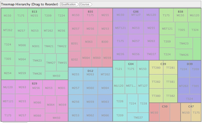 One of the reasons I started looking at various ways of visualising OU courses and qualifications was a conversation in which the main topic of conversation was how difficult it was for our students to see at-a-glance the possible courses they needed to take to get a particular qualification, given the courses they have already taken, or easily ascertain which qualification they may have made good progress towards given a set of individual courses they may have taken out of personal or professional interest.